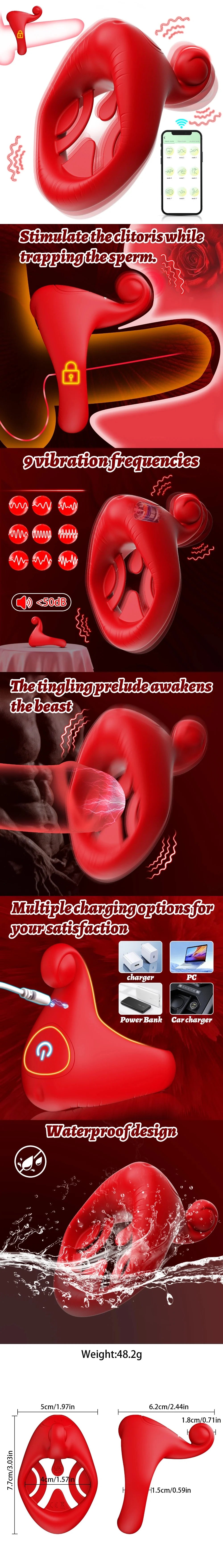Beyond a standard cock ring, this APP-controlled vibrating ring adds playful excitement with its distinctive red mouth design. Waterproof construction supports shower or bath play, and the flexible, size-inclusive structure ensures comfort for all users. Multiple charging options and whisper-quiet operation make it ideal for beginners or experienced couples. Enjoy a customizable, luxurious, and intimate experience tailored to your shared preferences.